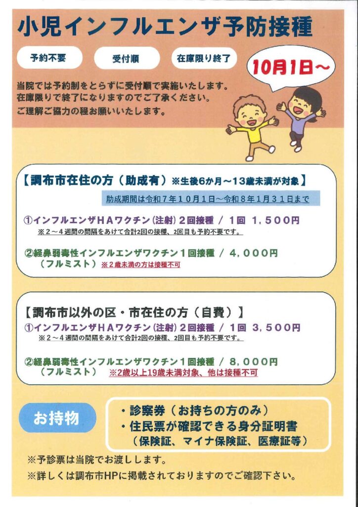 10月1日から各種インフルエンザワクチン接種を開始します。