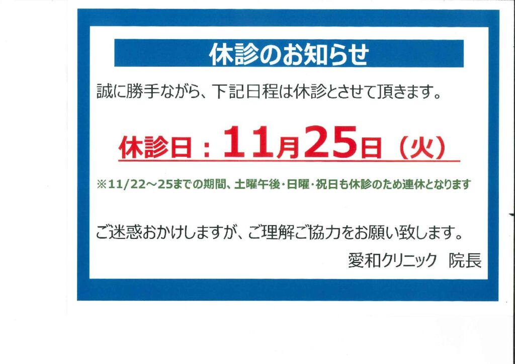 ※土曜午後・日曜・祝日は通常通り休診日のため、11/22午後~11/25の期間、連休となります